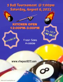 August 6 3-Ball Tournament 1:00pm Lunch Served 12:00-3:00pm by Kristi McCammon | Aug 2, 2022 | General News
