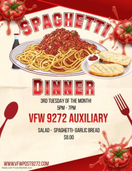 Spaghetti Dinner, 3rd Tuesday of the month, 5:00-7:00pm by Kristi McCammon | Nov 1, 2022 | General News